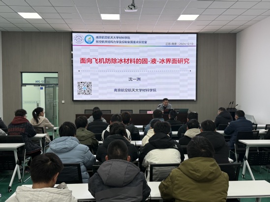12月13日下午,机械工程学院邀请到南京航空航天大学教授、博士生导师、国家高层次青年人才沈一洲,为我院师生做了“面向飞机防除冰功(智)能材料的固-液-冰界面研究”主题的学术讲座。